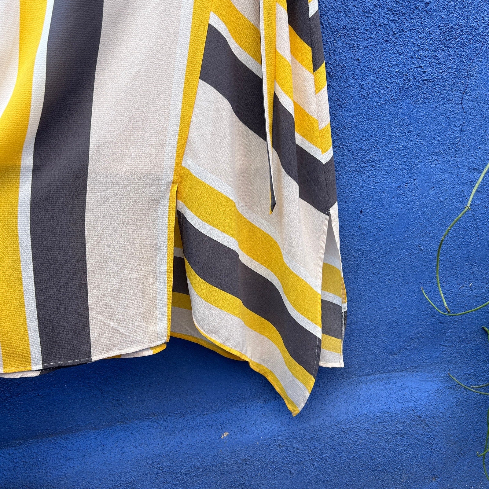 flowy and sweet with a bold mixed panel striped print / asymmetrical hem / side cinch belt detail / back zip closure with keyhole and button at neck / lined / good preowned condition with a small spot at breast (last photo)