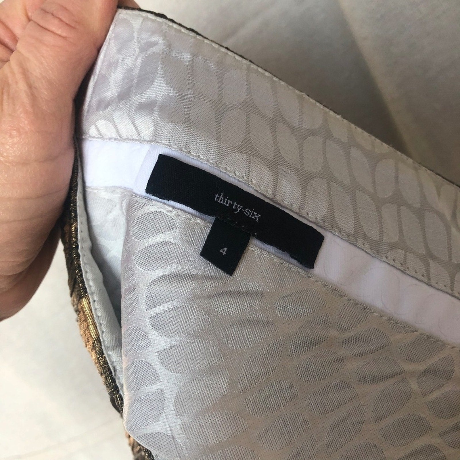 Classic and lovely / Textured, lightweight brocade fabric (no fabric tag, but definitely quality material) / Slit pockets / Excellent preowned condition, minus some discoloration on the top of the inside waistband