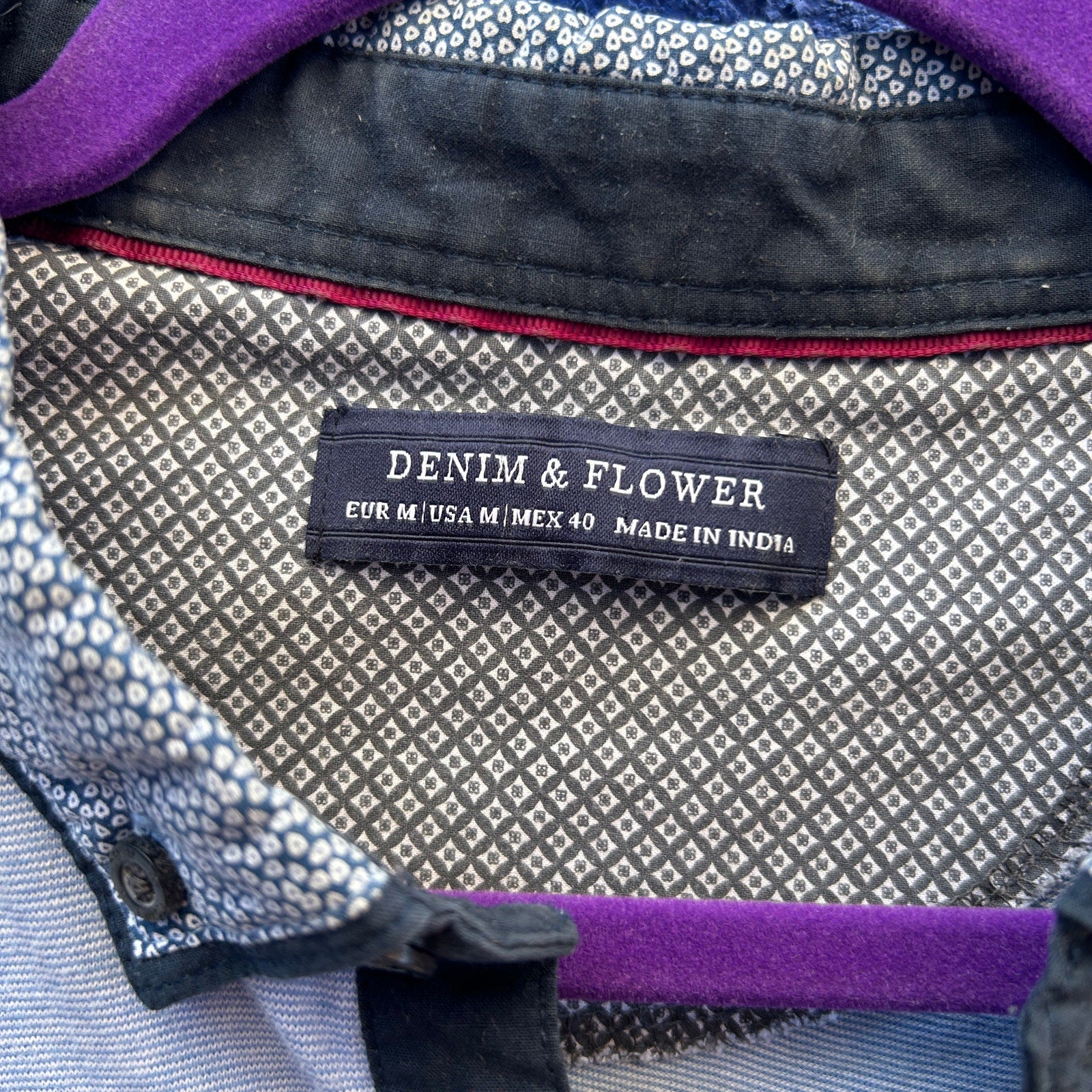 light blue cotton dashed with white throughout / contrast fabric at pocket and collar / good preowned condition with some minor wear