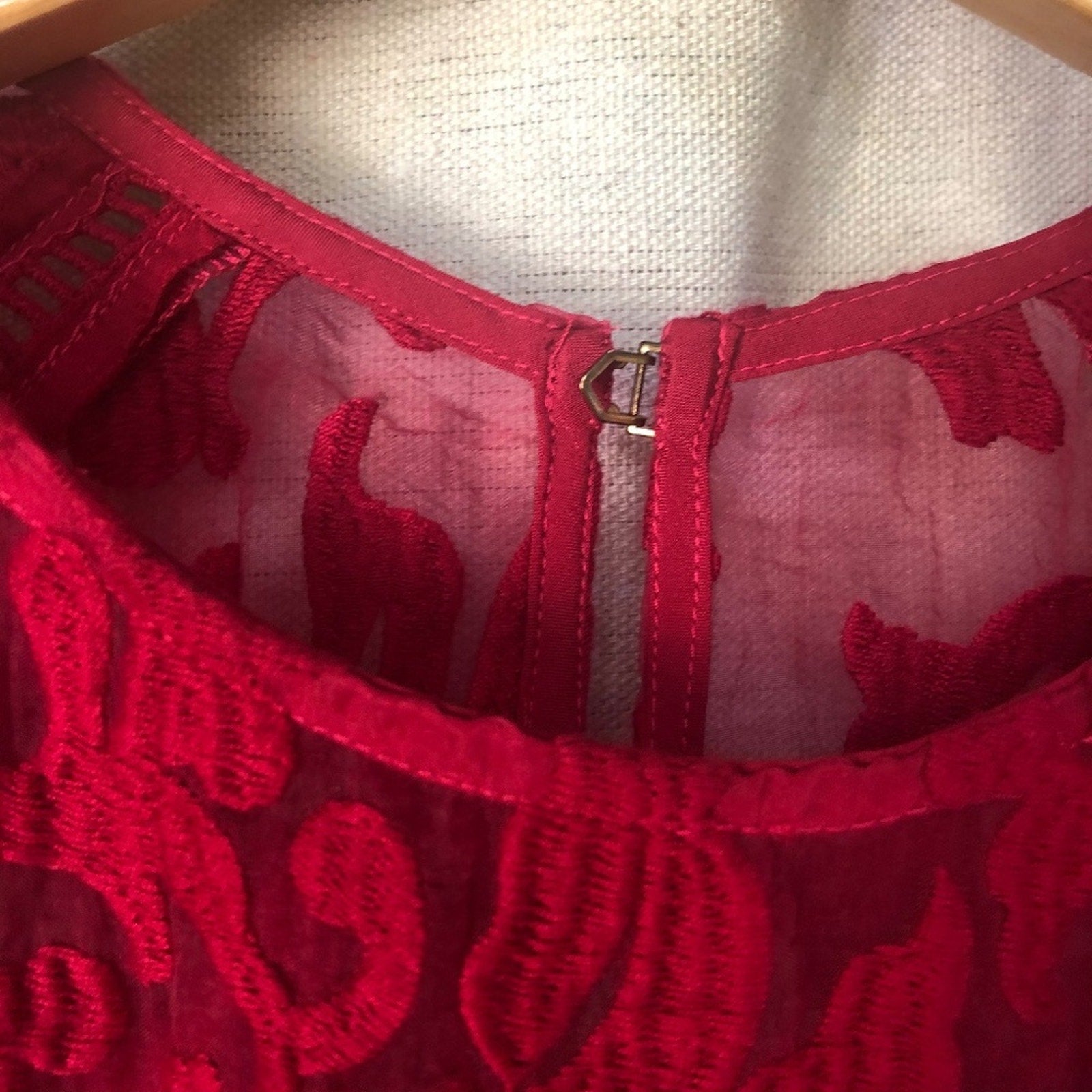 Gorgeous, bold, and sweet / Embroidered floral throughout / Lattice seam detail / Fitted bodice / Lined / Side zip closure / Excellent preowned condition