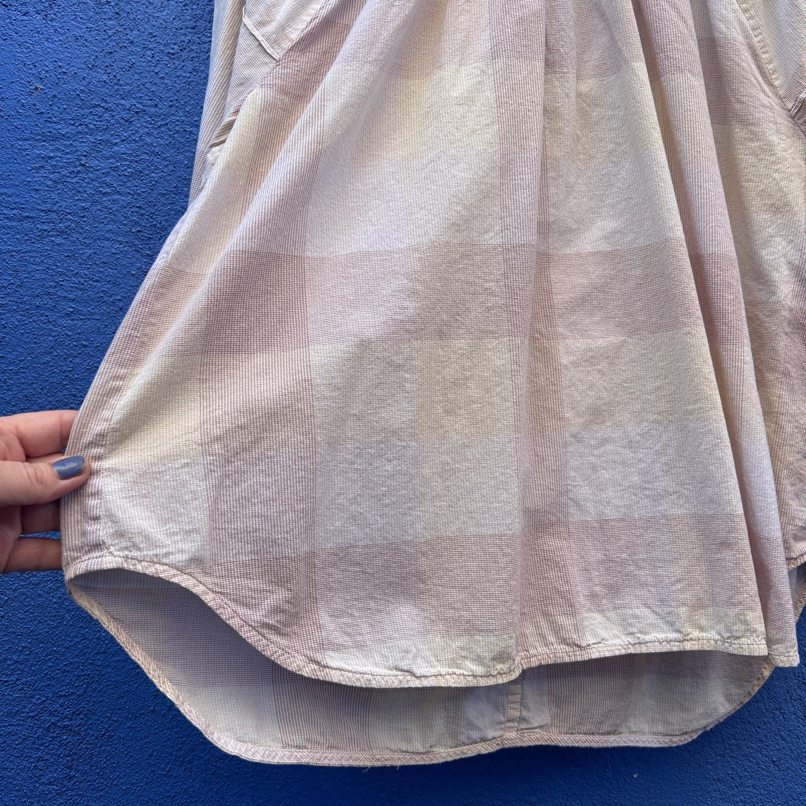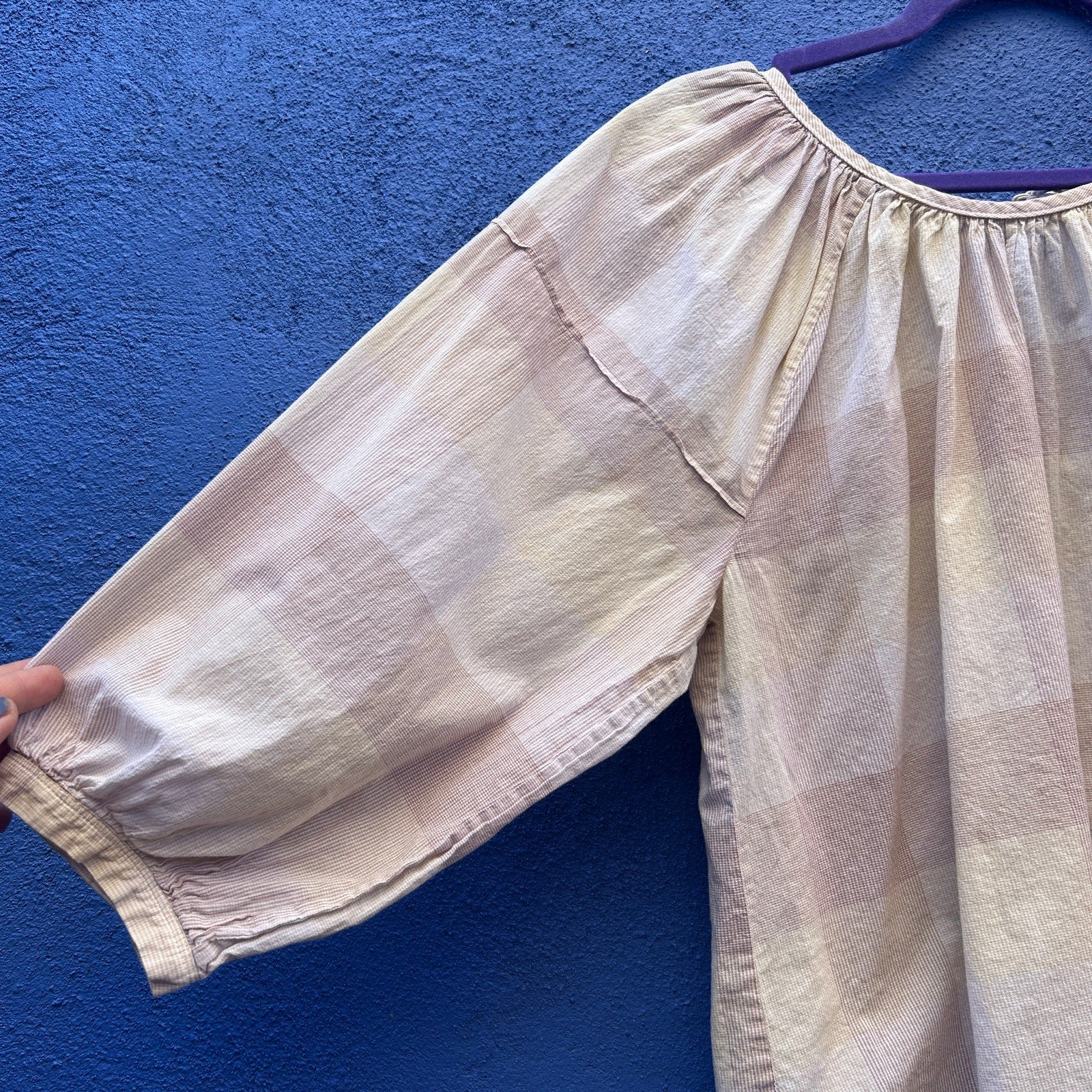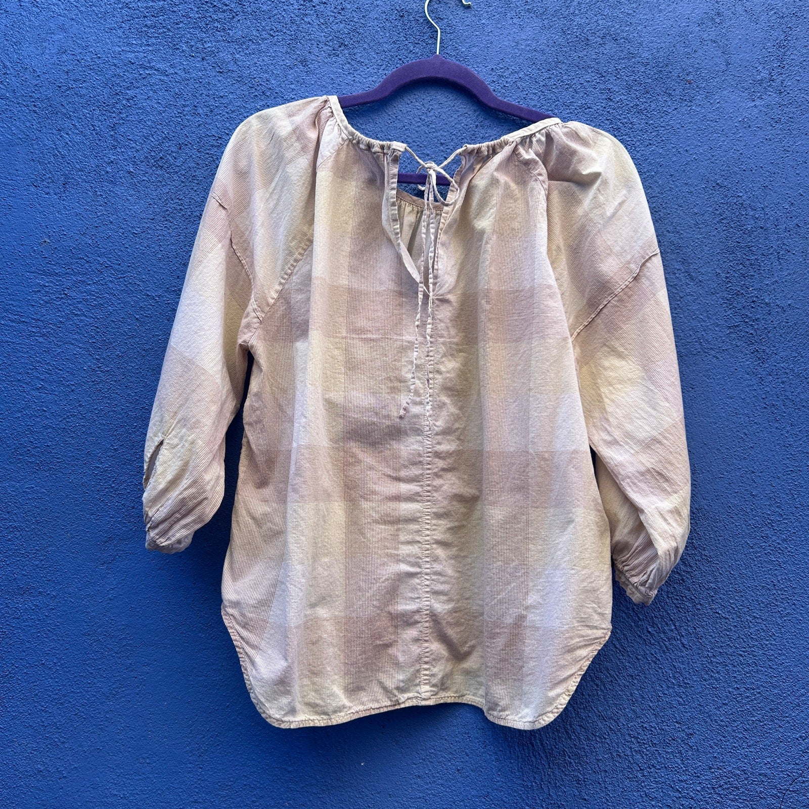 lightweight cotton in a loose-fit cut / super versatile style / muted tones / popover styling with tie at back neck / 3/4 sleeves / excellent preowned condition