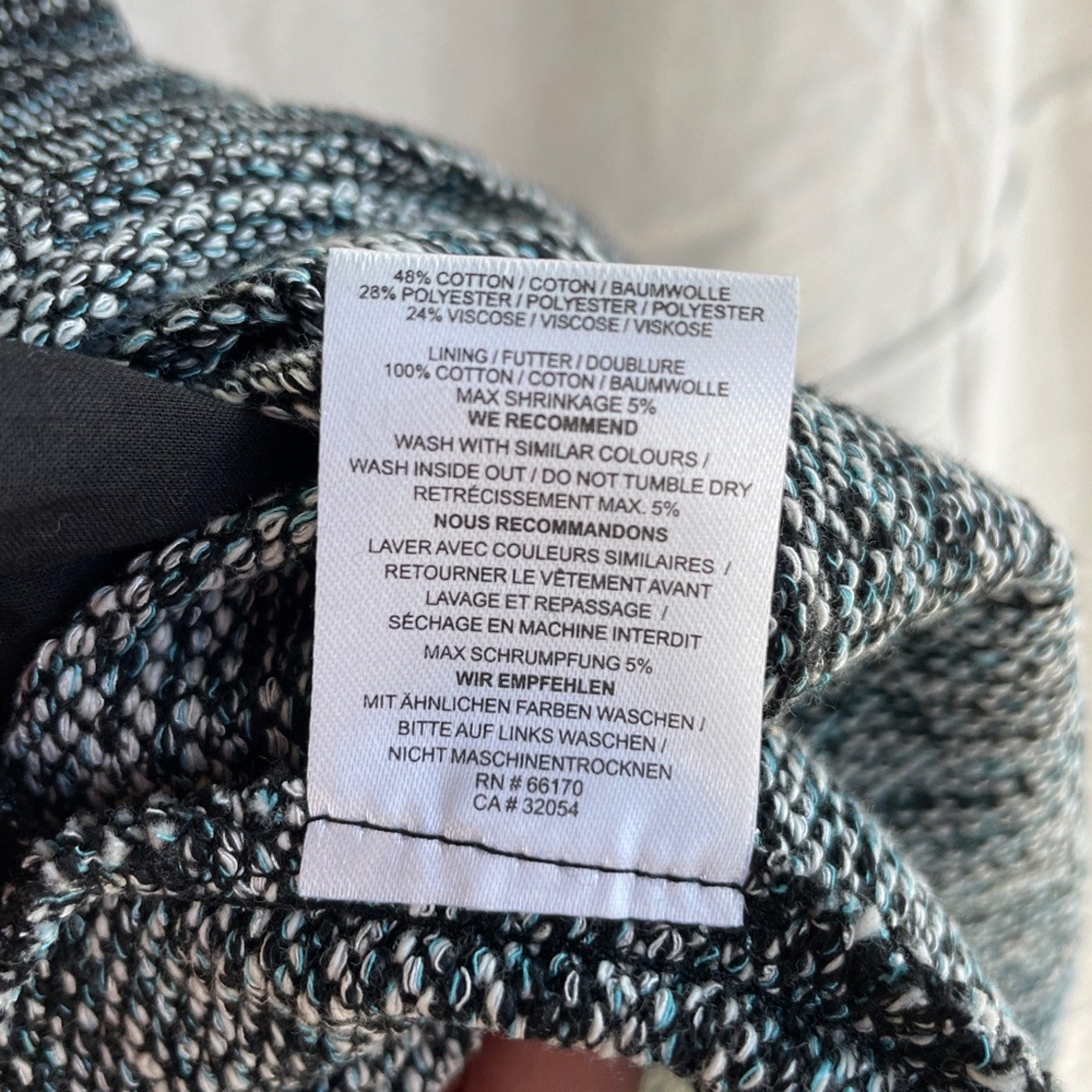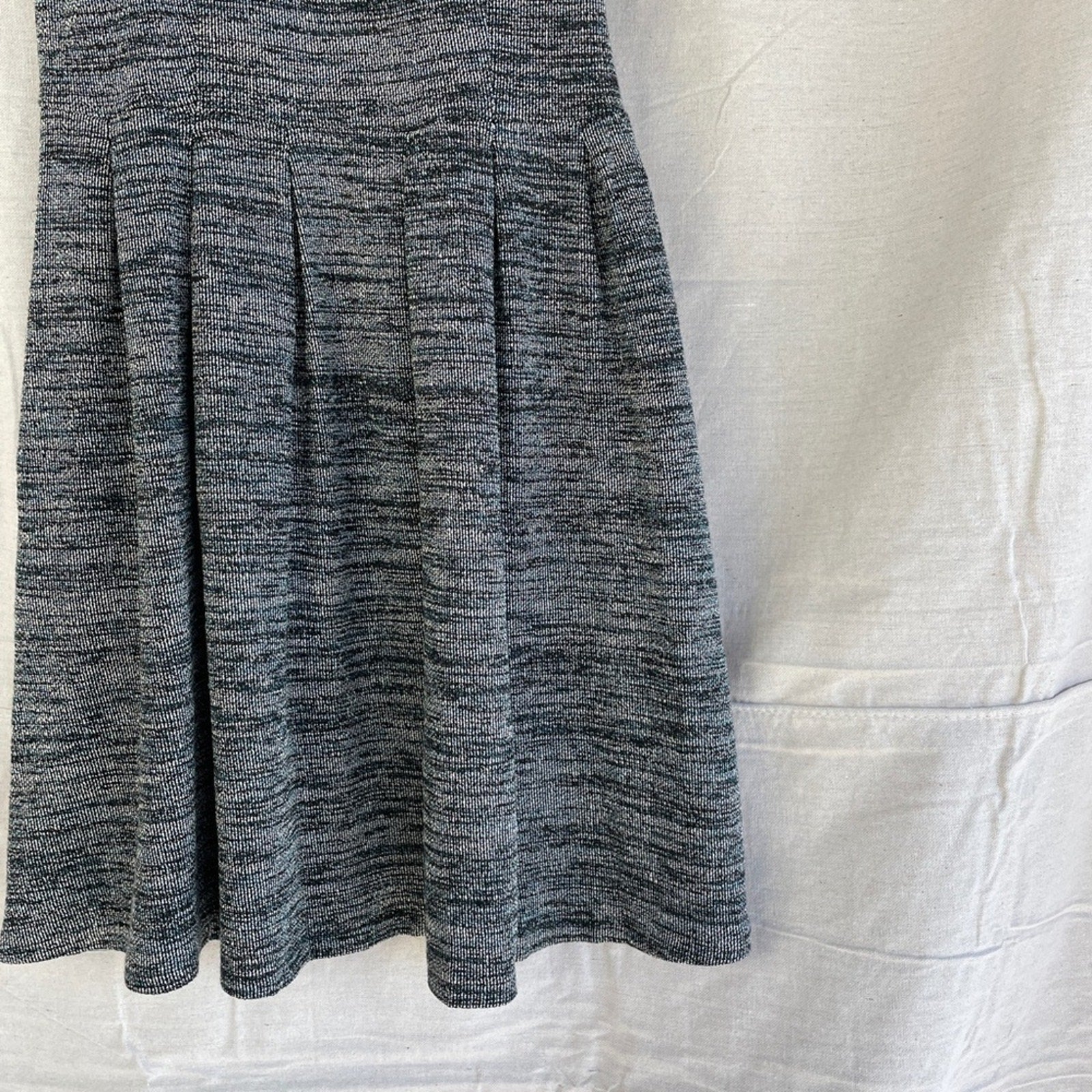 Soft textured knit in a fun, vintage vibe cut / High ruffle collar / Fitted bodice with pleated flared bottom / Side pockets / Back zip closure / Speckled turquoise, black and white knit / Excellent preowned condition