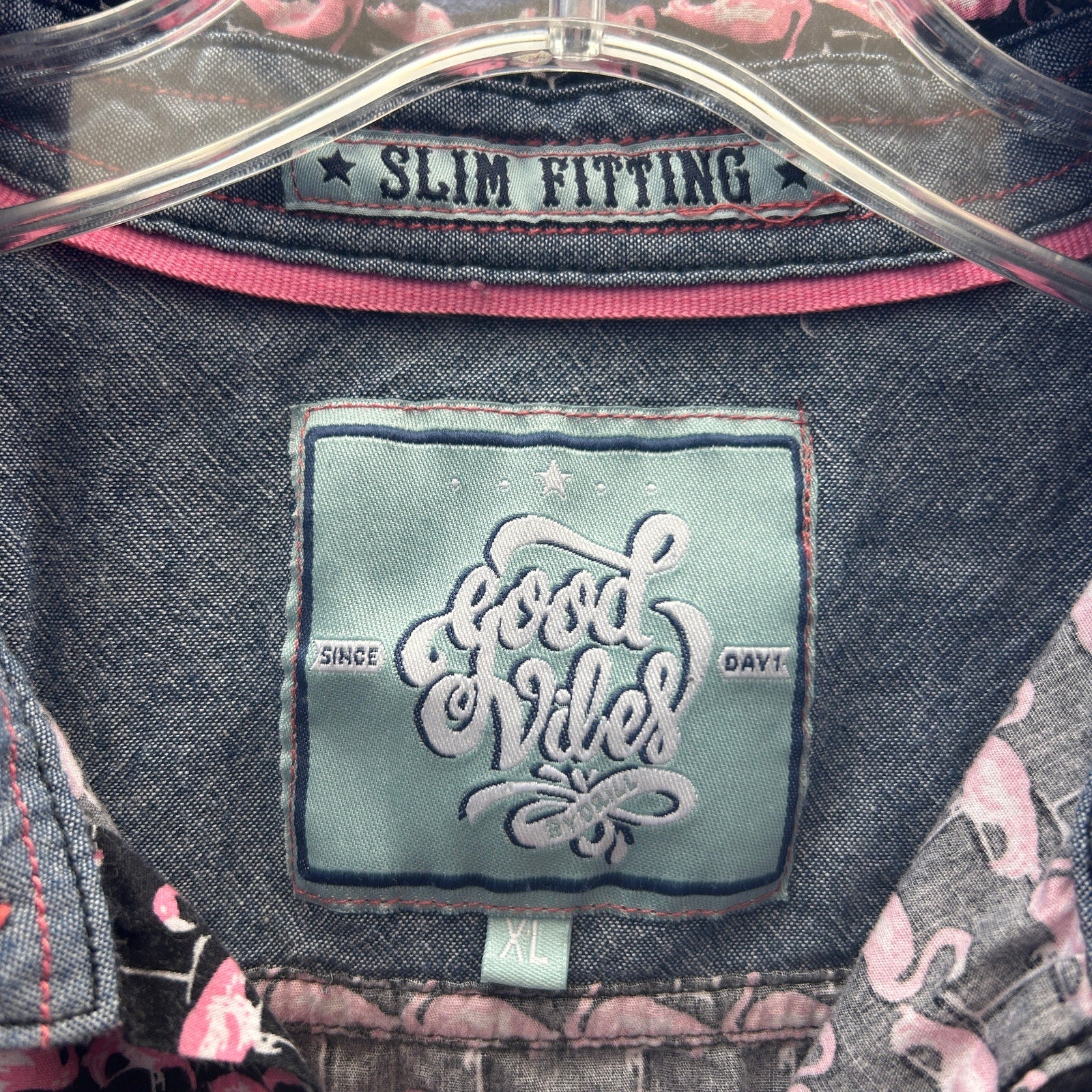 good vibes slim fitting pink flamingo short sleeve button up size extra large