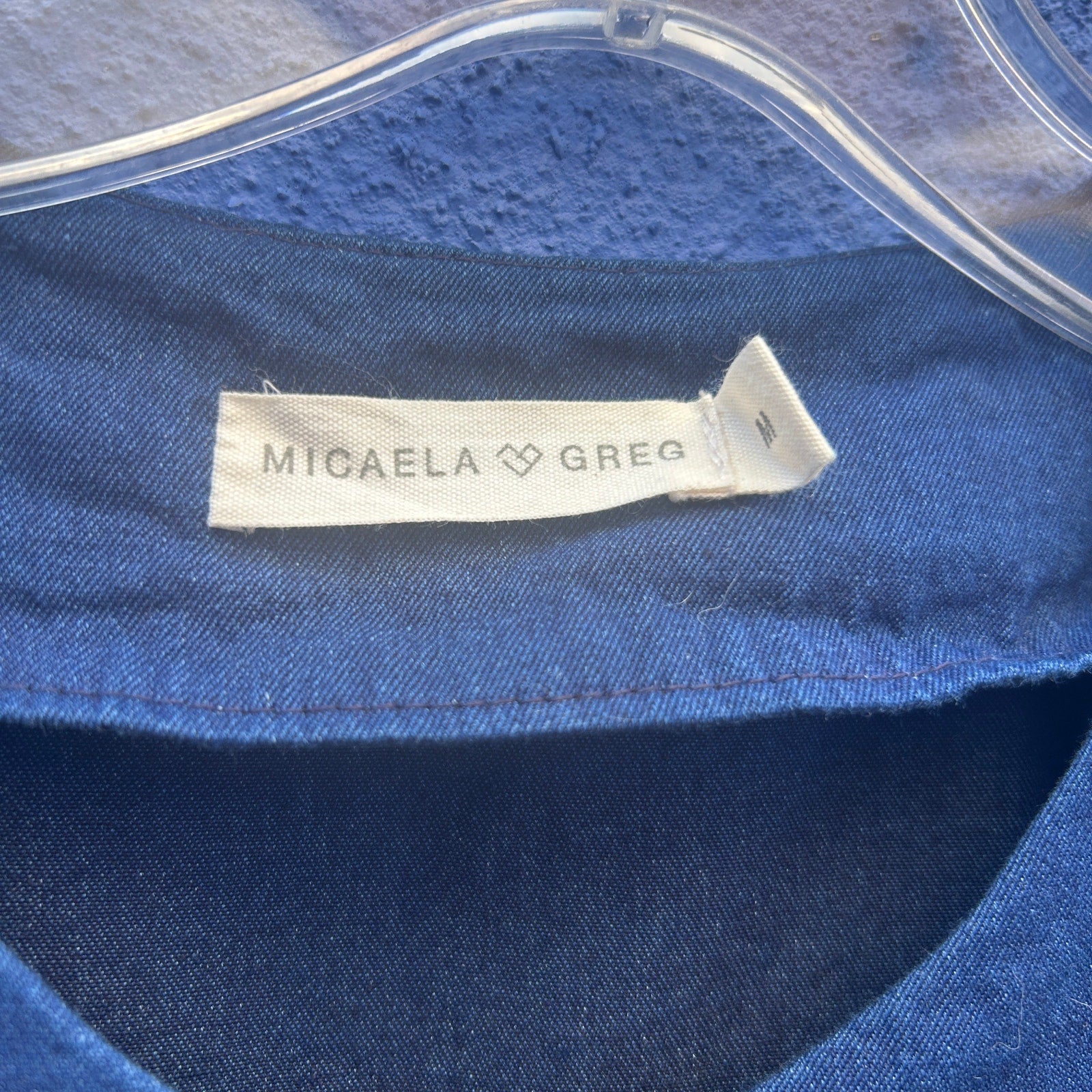 easy and sweet with a light denim feel / full button front / tie detail in front / dolman cut sleeves / excellent preowned condition