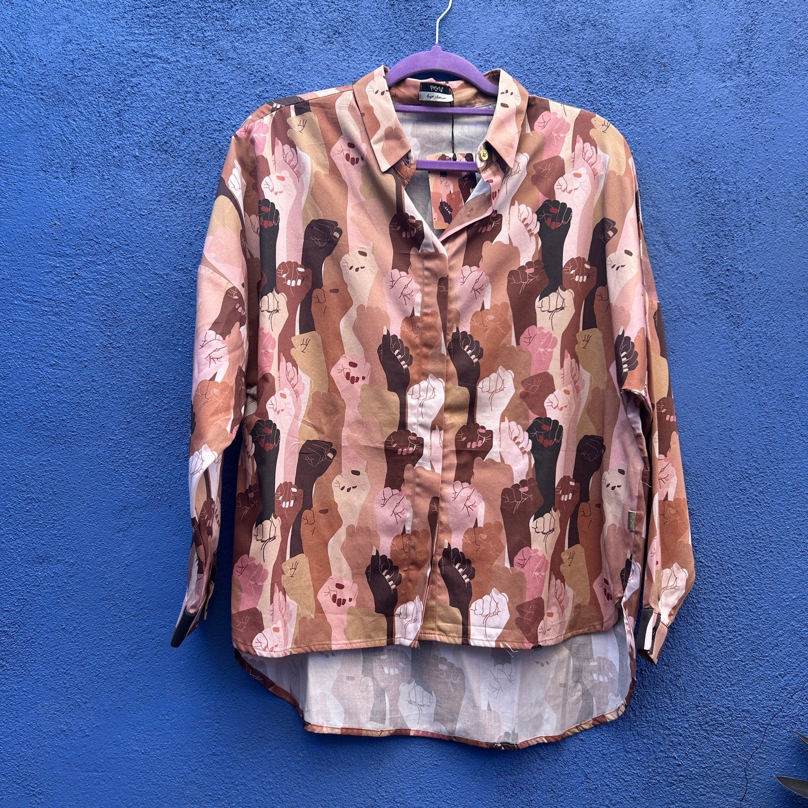 made in Spain on revolutionary printed cotton / powerful and unifying imagery / roomy cut with hi-low hemline / NEW