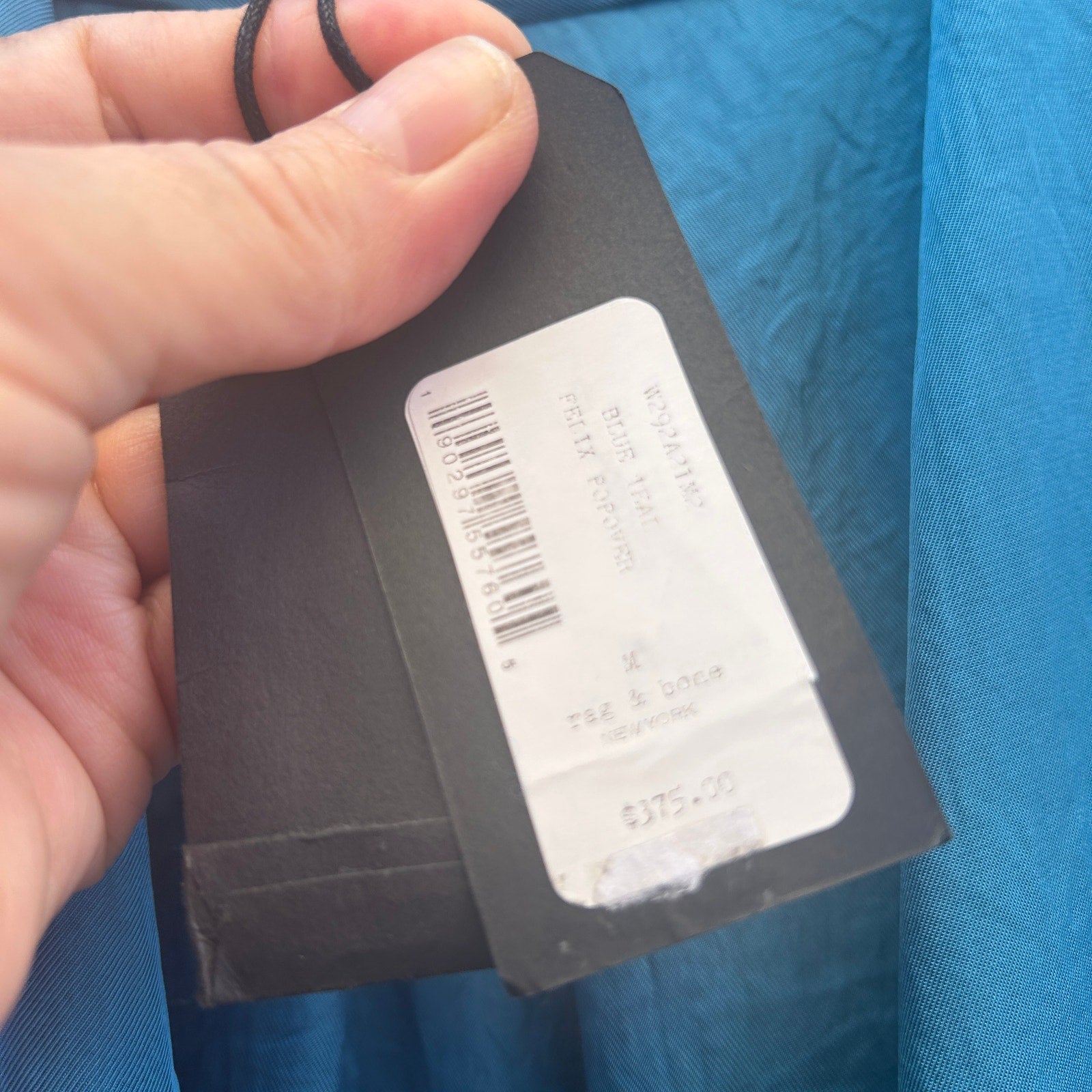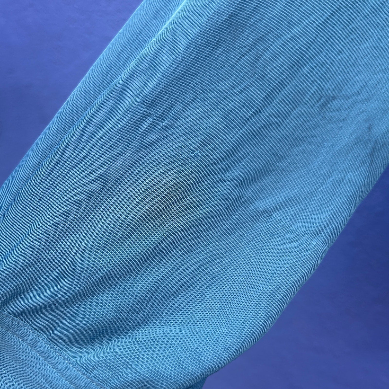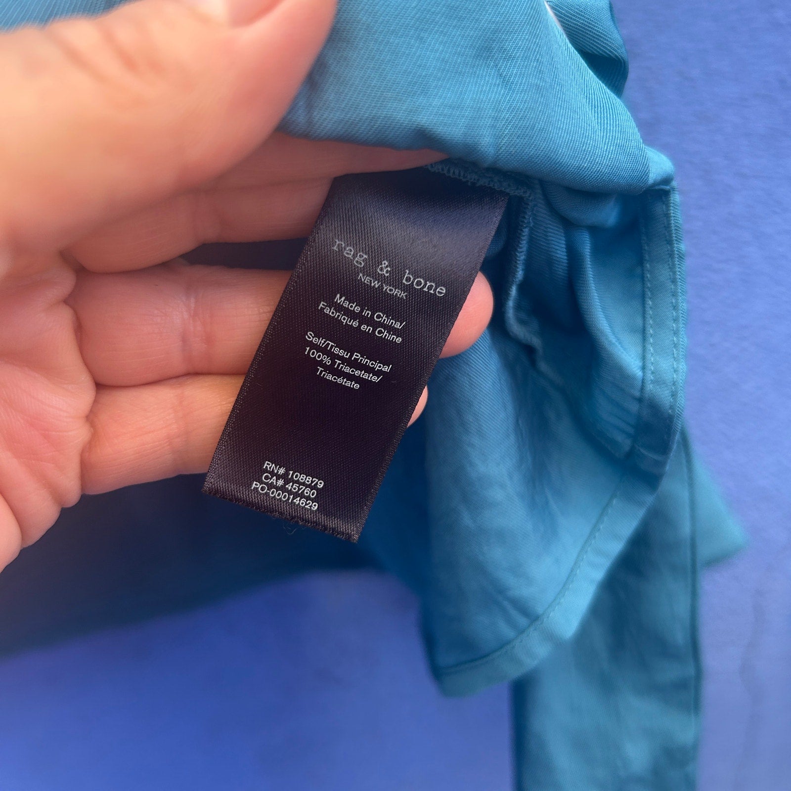 faux wrap with a snap closure at breast and grommet and tie at waist / flowing and oversized fit / yummy teal / new with tags (tag is a bit faded from storage)