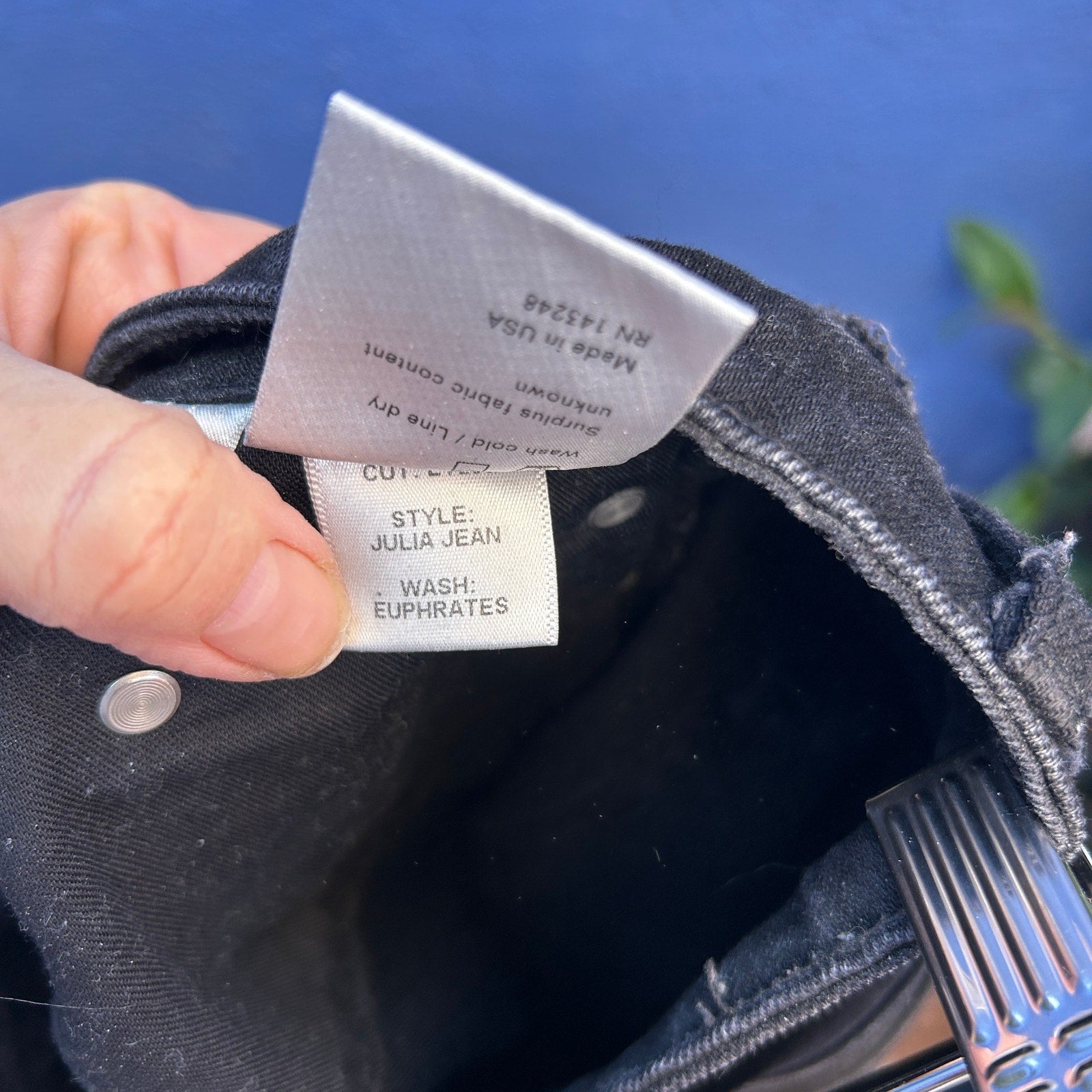 black denim with a great slight fade / distressing at waist and hem / excellent preowned condition