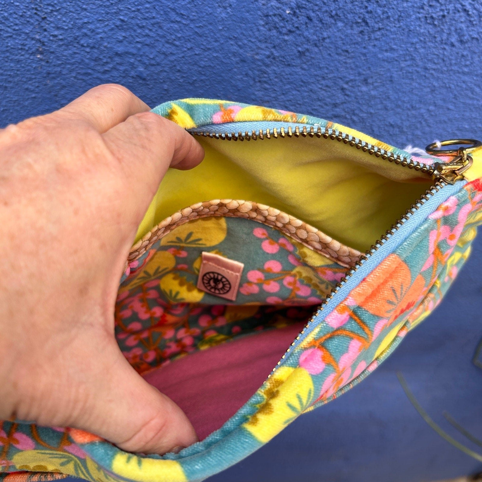 adorable retro floral print sueded velvet / artisan made from a repurposed vintage garment / top zip closure / contrast lining / inner slit pocket / NEW