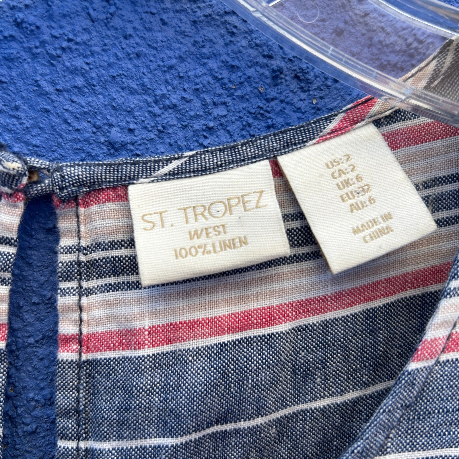 simple, classic, and versatile / perfect for vacations, errands, or brunch / dark blue-ish gray, red, tan and white striped linen / excellent preowned condition