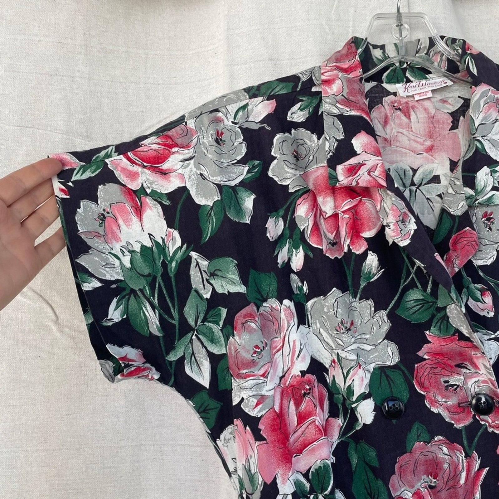 Union Made and super cute / Button front with faux double button detail / Shoulder pads / Short dolman sleeves / Pockets / Good preowned condition - missing thread for hook at waist and slight sun fading on left shoulder (last pictures) / No side tag, listing as medium based on measurements / Belt loops on sides, but no belt included / Cotton blend