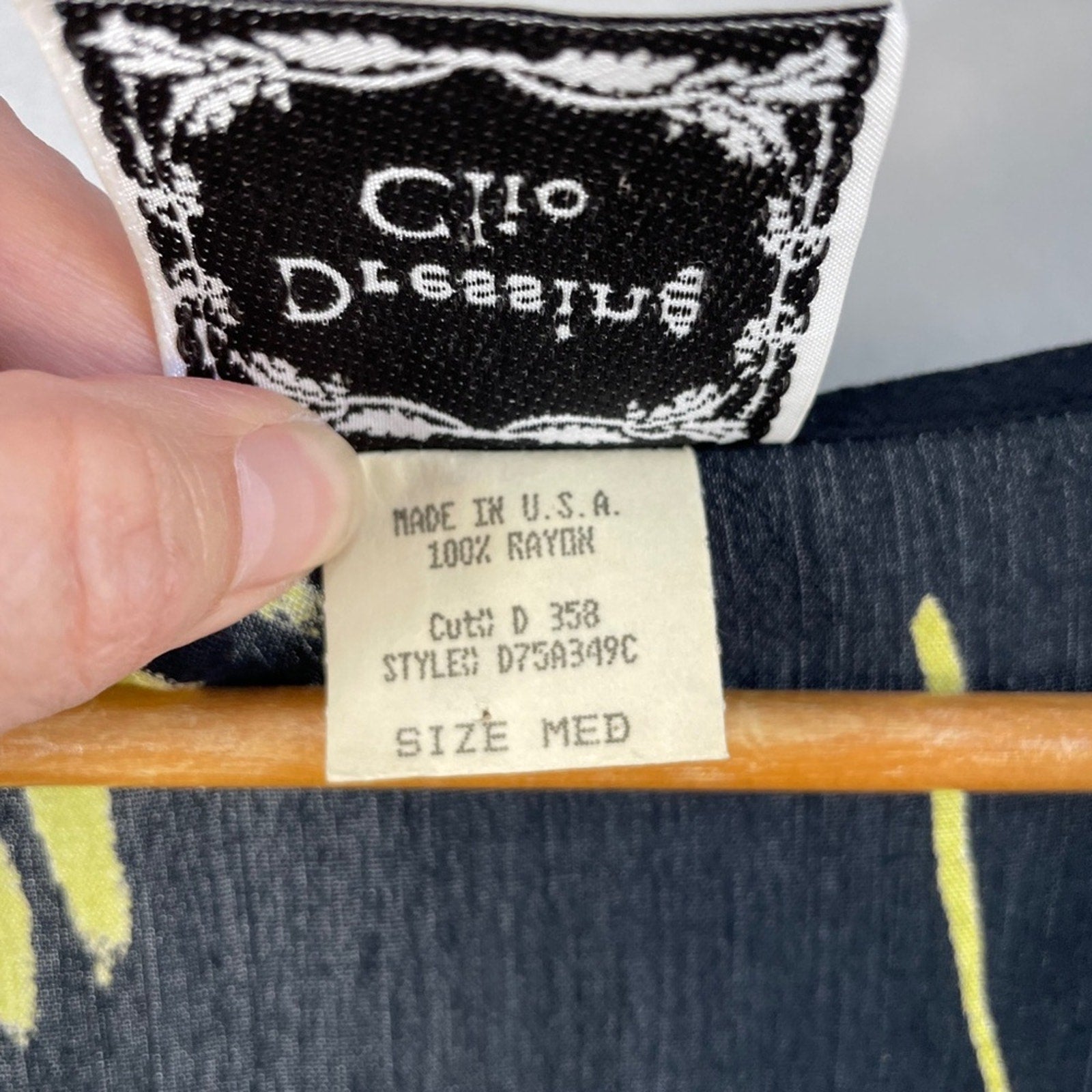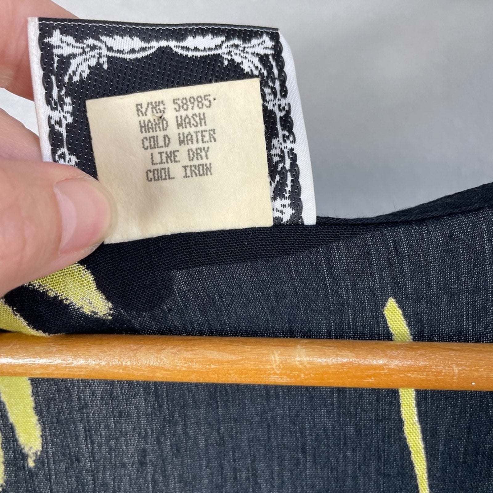 Black textured rayon with neon green leaf print / Scoop neck / Attached back tie / Big slouchy pockets / Great for a swim cover or everyday dress / Excellent preowned condition