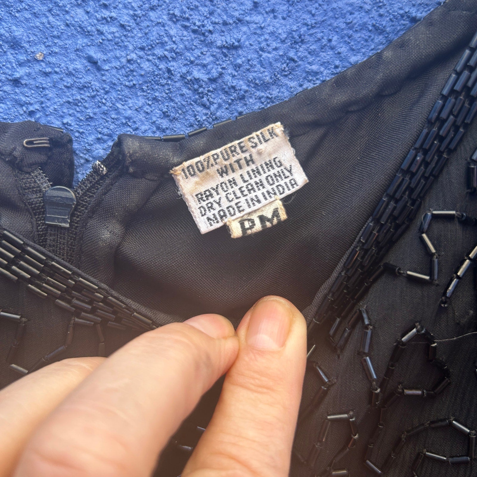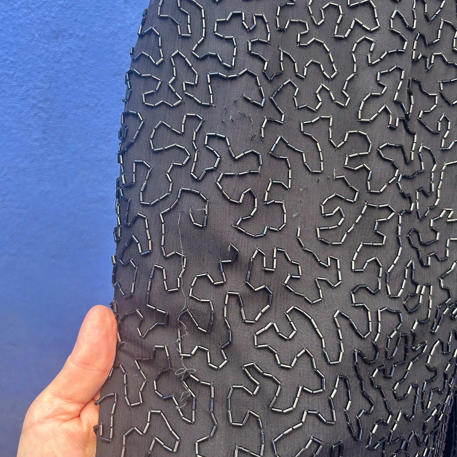 sweet, easy, and elegant / squiggle bead pattern / back zip and hook closure / good vintage condition with some missing beads and discoloration on the label